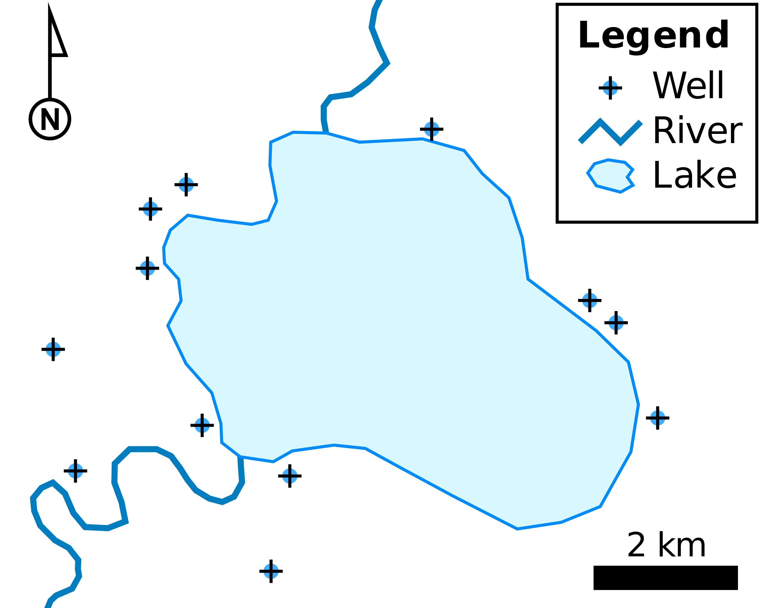 English: A simple vector map with: points (wells), polylines (rivers), and polygons (lake).