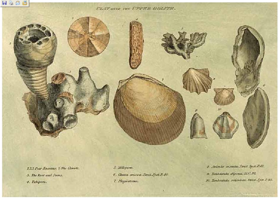 نقش من كتاب وليام سميث الصادر في 1815 حول التعرف على طبقات الأرض باستخدام الأحفورات.