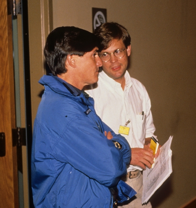 English: Alaska lieutenant governor Steve McAlpine listens to Ernie Piper, special assistant to Alaska governor Steve Cowper, during a meeting or press conference during the Exxon Valdez Oil Spill cleanup