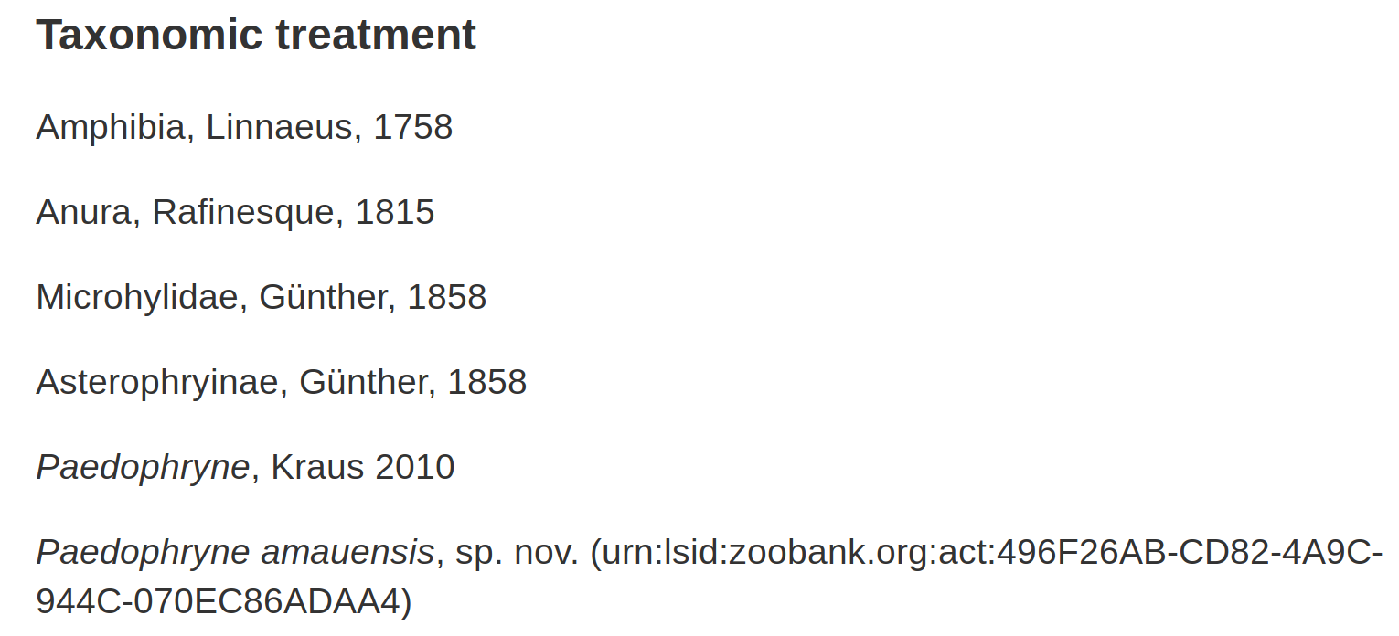 English: Taxon treatment for Paedophryne amauensis Rittmeyer, Allison, Gründler, Thompson & Austin, 2012. Includes the ZooBank identifier for this nomenclatural act.