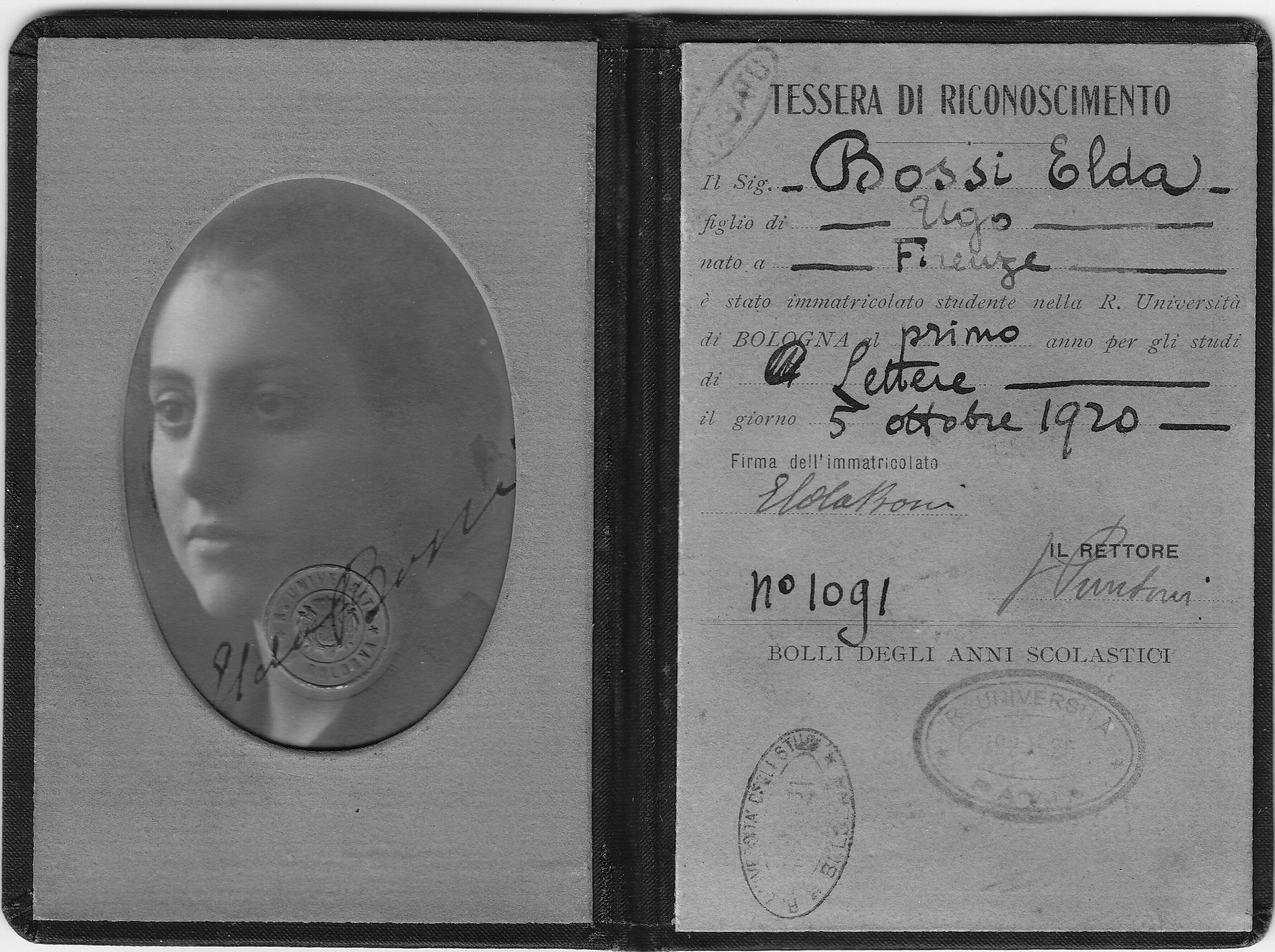 Italiano: Tesserino universitario della scrittrice fiorentina Elda Bossi
