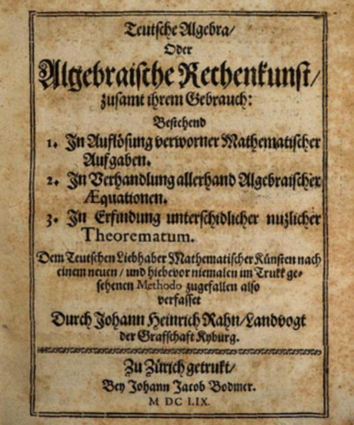 English: Frontpage of Teutsche Algebra (1659) by Johann Heinrich Rahn (1622-1676) Català: Primera plana de la Teutsche Algebra (1659) de Johann Heinrich Rahn (1622-1676)