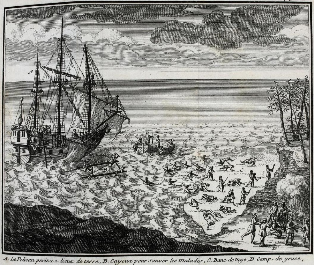 Français : Le naufrage du vaisseau le Pélican dans la baie d'Hudson en 1697. Guerre de la Ligue d'Augsbourg (1688-1697). Dessin publié en 1722 dans l'Histoire de l'Amérique septentrionale, par Claude-Charles Bacqueville de La Potherie, Paris. English: The French ship Pélican sinks following the en:Battle of Hudson's Bay (1697). From Histoire de l'Amérique septentrionale by Claude-Charles Bacqueville de La Potherie, Paris, Jean-Luc Nion and François Didot, 1722 (en:Library and Archives Canada, FC305 B326).