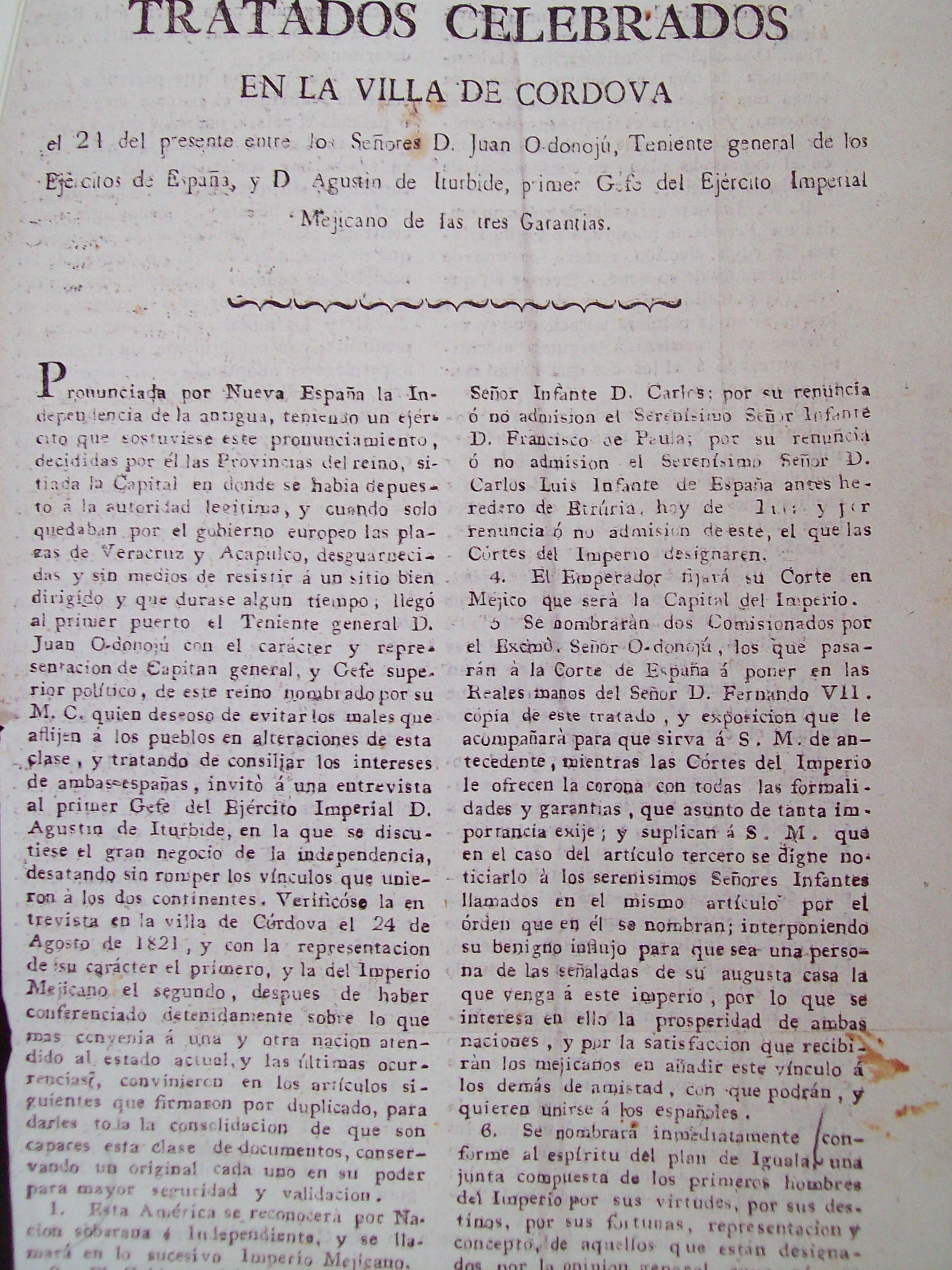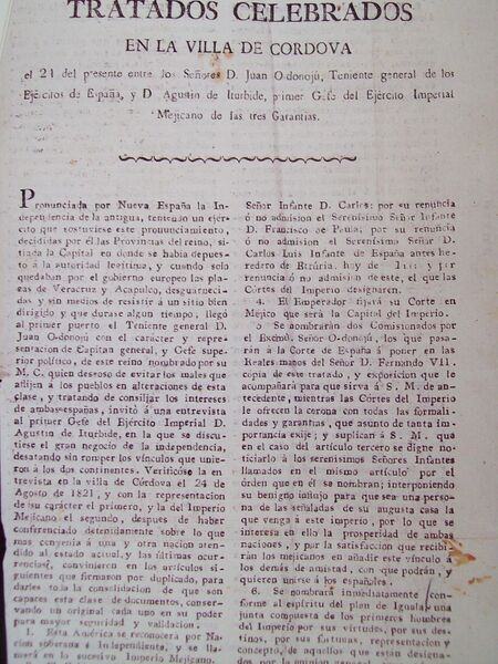 Español: Tratados de Córdoba. Versión impresa de los firmados el 24 de agosto de 1821. Archivo General de la Nación de México. Memoria de las revoluciones de México, tomo 5, 2009. ISBN 978-607-7748-04-5