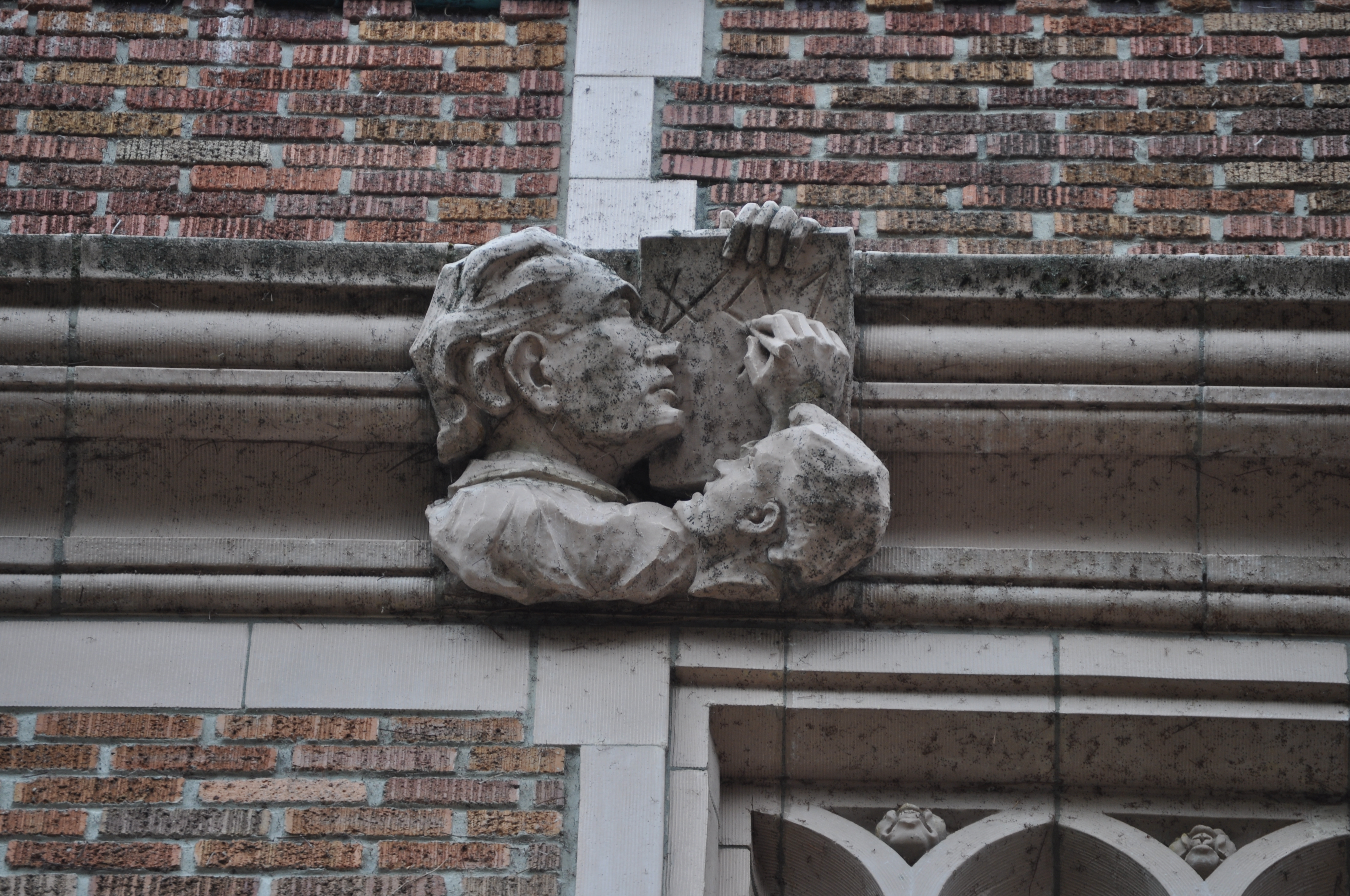 "Grammatist", sculpture by Alonzo Victor Lewis, 1922. South face of Miller Hall, University of Washington, Seattle, Washington, USA. The alphabetic characters depicted are Phoenician. One of many sculptures by Lewis for this building; there are also a few of his elsewhere at the University. |