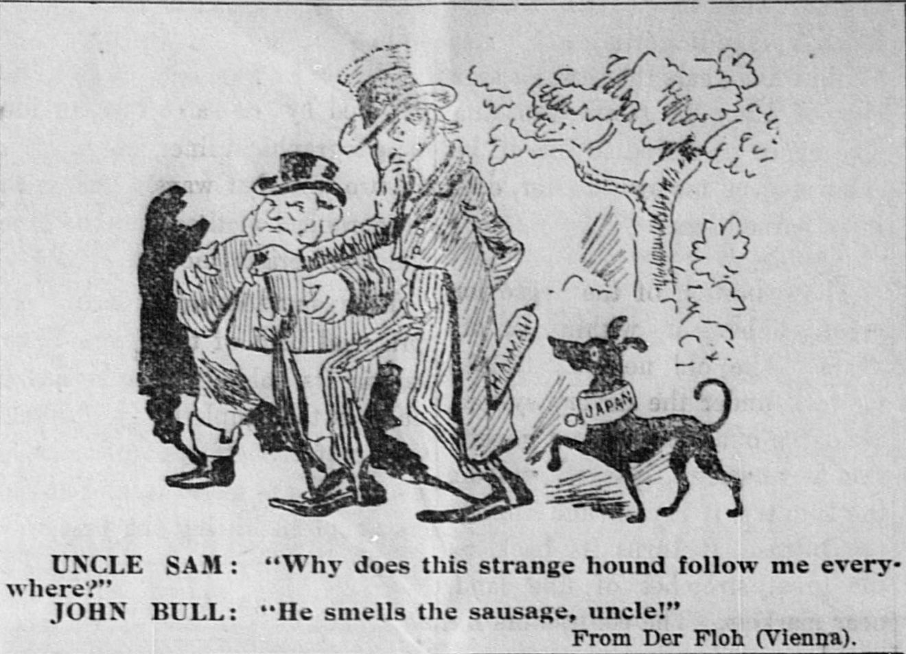 John Bull (personification of Britain): "He smells the sausage, uncle!" From Der Floh (Vienna) This cartoon appeared when the United States was deciding whether to annex Hawaii as an American territory. In the late 1890s, the United States was determining whether to annex Hawaii and other territories including Cuba, Puerto Rico, and the Philippines. American political cartoons often illustrated the concept of manifest destiny, or America's geopolitical expansion through colonization. Some cartoons would draw the United States as Uncle Sam and the territories considered for annexation as children, as if the United States was their warden. The children would often be drawn with dark skin and sometimes with grass skirts, nappy hair, or bare feet. Historically, political cartoons expressed, shaped, reinforced, and reflected social, political, and racial attitudes and the sociopolitical structure of society. Therefore, some newspapers used cartoons as propaganda to shape public opinion. As mirrors to public knowledge, cartoons showed what the public did or did not know about events and scandals. About the historical political cartoons in Hawaii newspapers: https://sites.google.com/a/hawaii.edu/ndnp-hawaii/Home/historical-feature-articles/political-cartoons The Hawaiian Gazette, August 20, 1897, Page 3, Image 3 http://chroniclingamerica.com/lccn/sn83025121/1897-08-20/ed-1/seq-3/ From the University of Hawaii at Manoa Library: https://www.flickr.com/photos/uhmlibrary/6809860643/ |
