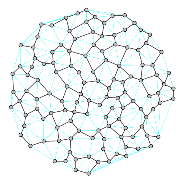 English: Example of Urquhart graph: the cyan edges are deleted from Delaunay triangulation.