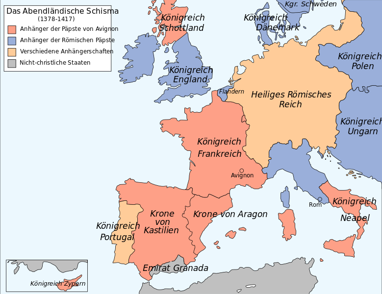 Deutsch: Karte des abendländischen Schismas 1378 bis 1417.