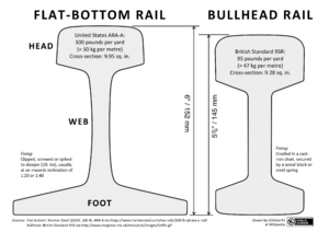 - تعتبر السكك بوزن 50 كجم/م و60 كجم/م هي المعايير الحالية على الخطوط الرئيسية في أماكن أخرى، على الرغم من أنه لا يزال يتم تصنيع بعض الأحجام الأخرى.[24][المصدر لا يؤكد ذلك]