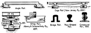 كانت أقدم السكك المستخدمة بشكل عام هي ما يسمى سكك الحديد ذات الحواف السمكية من حيث شكلها. كانت السكك الحديدية المصنوعة من الحديد الزهر هشة وتكسر بسهولة. لم يكن بإمكانها سوى أن تُصنع بأطوال قصيرة سرعان ما تصبح غير متساوية. حصل جون بيركنشو على براءة اختراع في عام 1820,[5] مع تحسين تقنيات الدرفلة، تم إدخال الحديد المطاوع بأطوال أطول، ليحل محل الحديد الزهر ويساهم بشكل كبير في النمو الهائل للسكك الحديدية في الفترة من 1825 إلى 1840. كان المقطع العرضي يختلف على نطاق واسع من خط إلى آخر، ولكنها كانت من ثلاثة أنواع أساسية كما هو موضح في الرسم البياني. كان المقطع العرضي المتوازي الذي تطور في السنوات اللاحقة يُشار إليه بـ رأس الثور.