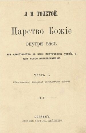 The Kingdom of God Is Within You (pre-reform Russian: Царство Божіе внутри васъ; post-reform روسية: Царство Божие внутри вас, romanized: Tsárstvo Bózhiye vnutrí vas) is a non-fiction book written by Leo Tolstoy. A Christian anarchist philosophical treatise, the book was first published in Germany in 1894 after being banned in his home country of Russia.[1] It is the culmination of 30 years of Tolstoy's thinking and lays out a new organization for society based on an interpretation of Christianity focusing on universal love.