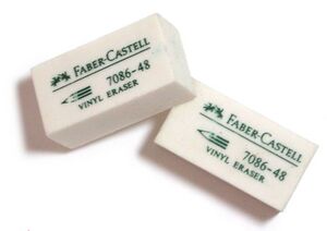 High-quality plasticized vinyl or other "plastic" erasers, originally trademarked Mylar in the mid-20th century[بحاجة لمصدر], are softer, non-abrasive, and erase cleaner than standard rubber erasers. This is because the removed graphite does not remain on the eraser as much as rubber erasers, but is instead absorbed into the discarded vinyl scraps. Being softer and non-abrasive, they are less likely to damage canvas or paper. Engineers favor this type of eraser for work on technical drawings due to their gentleness on paper with less smearing to surrounding areas. They often come in white and can be found in a variety of shapes. More recently, very low-cost erasers are manufactured from highly plasticized vinyl compounds and made in decorative shapes.