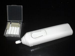 A fiberglass eraser, a bundle of very fine glass fibers, can be used for erasing[9] and other tasks requiring abrasion. Typically the eraser is a pen-shaped device with a replaceable insert with glass fibers, which wear down in use. The fibers are very hard; in addition to removing pencil and pen markings, such erasers are used for cleaning traces on electronic circuit boards to facilitate soldering, removing rust, and many other applications. As an example of an unusual use, a fiberglass eraser was used for preparing a Pterosaur fossil embedded in a very hard and massive limestone.[10] Because fiberglass erasers shed fiberglass dust when used, care must be taken during and after use to avoid accidental contamination with this abrasive dust in sensitive areas of the body, especially in the eyes.