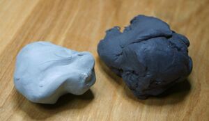 The stylized word "Art gum" was first used in 1903 and trademarked in the United States in 1907.[6] That type of eraser was originally made from oils such as corn oil vulcanized with sulfur dichloride[7] although it may now be made from natural or synthetic rubber or vinyl compounds. It is very soft yet retains its shape and is not mechanically plastic, but crumbles as it is used. It is especially suited to cleaning large areas without damaging the paper. However, they are so soft as to be imprecise in use. The removed graphite is carried away in the crumbles, leaving the eraser clean, but resulting in a lot of eraser residue. This residue must then be brushed away with care, as the eraser particles are coated with the graphite and can make new marks. Art gum erasers are traditionally tan or brown, but some are blue.