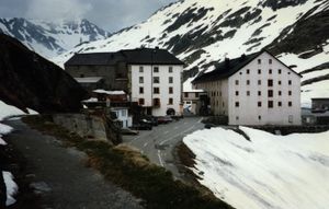 The hospice straddles the highest point of the road, which is in Switzerland. Today the modern road for through traffic has been routed around the outside of the monastery buildings to allow some integrity of the grounds. The old road may still be seen, above the paved road. The hospice occupies two buildings, of 1560 and 1898 (picture, right). The Congregation of Canons of the Great Saint Bernard (the monks) also owns the Hôtel de l'Hospice du Grand-St-Bernard, a four-story building made of grey stone (built in 1899) on the Italian side, which it leases to a private entrepreneur for the provision of hotel services.[8]
