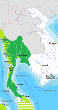 The lower Chao Phraya Basin around the turn of the second millennium was split between Lavo Kingdom, which dominated the eastern half of the Lower Chao Phraya, and Suphannabhum, which dominated the west. The western lower Chao Phraya Basin was also influenced by Angkorian culture but not direct Angkorian political and military influence.[10][18] Ayutthaya, argued by Charnvit Kasetsiri, was the merger of four different port polities along the Lower Chao Phraya Basin: Lopburi (Lavo),[19] Suphanburi, Ayutthaya, and Phetchaburi. Suphanburi had first sent a tribute mission to Song dynasty in 1180 and Phetchaburi to the Yuan dynasty in 1294 and tribute missions to Vijaynagar empire between 1400 and 1500.[20][6][21] The earliest written records of Ayutthaya in the Chinese chronicles is that a Chinese official fled to Xian in 1282/83. Xian first sent an embassy to the Yuan dynasty in 1292, after which the Yuan requested another embassy. While older and traditional scholars argue that the ethnically Thai Sukhothai or Suphanburi was the Xiān[22][20] mentioned in Chinese sources, more recent scholarship, like Chris Baker and Pasuk Phongpaichit, argue that Xian referred to Ayutthaya as that was the same name later used for Ayutthaya by the Chinese court. Michael Vickery argued that it is likely the Chinese used Xian to refer to the lower Chao Phraya Basin from its inception.[6][23]