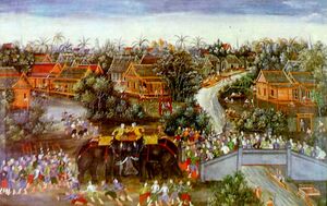 Ayutthaya was traditionally founded by King Uthong on 4 March 1351.[64] This fact, however, has been subject to long scholarly debate. According to Chris Baker-Pasuk Phongpaichit, there are at least seven legends about who Uthong was: "a Northern Thai prince, a fugitive Chinese prince from the sea, a Khmer noble from Angkor, a ruler from one of the gulf cities, or a Chola."[65] Other than being the legendary founder of Ayutthaya, the only thing known about Uthong in the chronicles is the year of his death.[6]