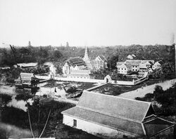 The palaces and temples that marked Ayutthaya as a royal capital was reduced to "heaps of ruins and ashes".[120] The city, described by a Danish visitor in 1779 to be a "terrible spectacle", totally buried in undergrowth and inhabited by elephants and tigers,"[120] was resettled quite soon after, with former Ayutthaya temples being used for festivals and celebrations following the sack.[121] According to one historian, the post-Ayutthaya monarchs were the real demolishers of the former capital,[122] they took apart most of the ruins that survived the Burmese sack for the construction of the new capital at Bangkok for symbolic and practical reasons; Bangkok was the successor of Ayutthaya in the eyes of the new Bangkok elite and therefore had to transfer its spiritual power through the reuse of its bricks to build Bangkok[123] while the prospect of future Burmese invasions meant that there was not enough time to build a capital via the traditional method during the early Rattanakosin Kingdom.[122]