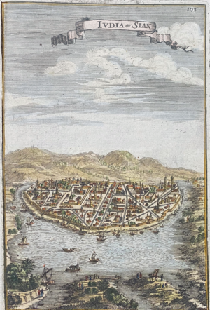 In foreign accounts, Ayutthaya was called "Siam",[11] but people of Ayutthaya called themselves Tai, and their kingdom Krung Tai (تايلندية: กรุงไท) meaning 'Tai country' (กรุงไท).[12] It was also referred to as Iudea in a painting requested by the Dutch East India Company.[13][بحاجة لمصدر] The capital city of Ayutthaya is officially known as Krung Thep Dvaravati Si Ayutthaya (تايلندية: กรุงเทพทวารวดีศรีอยุธยา), as documented in historical sources.[14][15][16][17]
