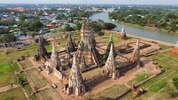Archaeology surveys performed near Wat Khun Mueang Jai have found traces of pre–1100s buildings. Old temples in the area to the east may have been forest monasteries, similar to the pattern of other early towns. Digs have yielded pottery shards dating back to the 1270s.[41] According to the Northern Chronicle, the earliest settlement was found in 934[ii] on the south bank of Lopburi River near the present-day Wat Thammikarat by a royal lineage from Bang Pan (present-day in Phran Kratai, Kamphaeng Phet), Phra Maha Buddha Sakorn (พระมหาพุทธสาคร),[42] who ruled the city until he died in 964.[43] However, his successor was despoiled by Narai (not to be confused with King Narai reigning from 1656 to 88), the son of King Chadachota from Lavo Kingdom,[43] who was of the Suphannabhum lineage.[44] Narai renamed the city Ayodhya (อโยธยา) and eventually set it Lavo's new capital.[45] The former capital was then renamed Lopburi.[46] The majority of Ayodhya's inhabitants are supposed to have migrated from Dvaravati's Ayojjhapura following its fall in 946, as well as residents from Lavo's Lavapura who fled after the city was destroyed by Angkor in 1001.[47] The rising of Ayodhya happened after the fall of Kamalanka or Mevilimbangam, centered at Nakhon Pathom, which was sacked by the Chola and Pagan in 1030 and 1058, respectively.[48][49] Ayodhya then overshadowed Lopburi and other cities in the lower Chaophraya Plain by exploiting opportunities created by the decline of the Srivijaya trading network in the 13th century.[41]