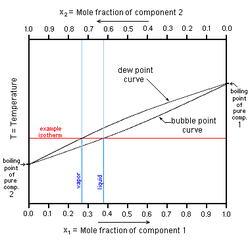 في هذا الشكل إلى اليسار سائل نقي 2 [ مثل الماء] له درجة غليان مبينة على المحور الرأسي إلى اليسار وإلى اليمين سائل نقي 1 [مثل كحول) وله درجة غليان نقرؤها على المحور الرأسي إلى اليمين. ويبين المحور الأفقي النسبة الموليه وهي تقول أنه عند المحور اليساري تكون نسبة الكحول في الماء 0، فقد افترضنا هنا وجود الماء النقي ودرجة غليانه مبين على المحور الرأسي. فإذا تابعنا زيادة نسبة الكحول في الماء بالانزياح إلى يمين المحور الأفقي، نجد أن نسبة الكحول تتزايد حتى تصبح 1 (أو 100%) عند المحور الرأسي حيث يوجد كحول نقي و 0 ماء. ونستطيع قراءة نقطة غليان الكحول النقي على محوره.