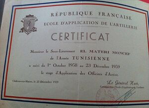 صورة لشهادة تخرج منصف الماطري من مدرسة سان سير العسكرية سنة 1958.