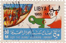 في 7 يونيو 1962، قامت OAS بإشعال النار في مكتبة جامعة الجزائر، مدمرة إجمالي 112,500 كتاب. In case you are wondering what sort of organisation is this OAS, it is a militant underground group opposed to the movement of the Algerian independence. As a result, the event triggered a series of commemorative postal stamps from various countries including Libya, where the event became a symbol of Algerian wars against oppression and for freedom and independence. The Libyan stamp is remarkably similar to the stamp issued by Yemen in the same year.