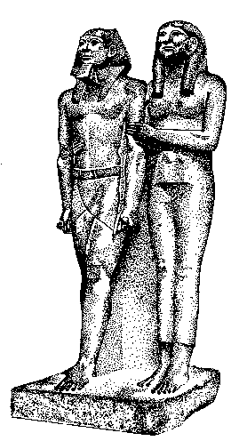 Menkaura flanked by the goddess Hathor (left) and a nome goddess (right). Basalt statue in Cairo Museum.