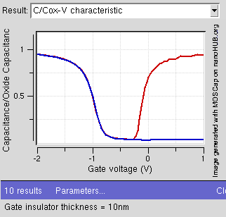 ملف C-V لكتلة موسفت بسماكة أكسيد مختلفة. يتوافق الجزء الموجود في أقصى اليسار من المنحنى مع التراكم. يتوافق الغور في المنتصف مع النضوب. يتوافق المنحنى الموجود على اليمين مع الانعكاس
