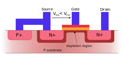 مقطع عرضي عبر nMOSFET عندما يكون جهد البوابة VGS أقل من عتبة إنشاء قناة موصلة؛ يوجد توصيل ضئيل أو معدوم بين محطات الصرف والمصدر؛ التبديل مغلق. عندما تكون البوابة أكثر إيجابية، فإنها تجذب الإلكترونات، مما يؤدي إلى إحداث قناة موصلة من النوع "n" في الركيزة الموجودة أسفل الأكسيد، مما يسمح للإلكترونات بالتدفق بين المحطات الطرفية n؛ المفتاح قيد التشغيل.