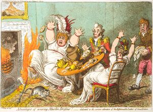In Advantages of wearing Muslin Dresses! (1802), James Gillray satirically pointed out a hazard of untreated muslin: its flammability.