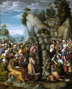 Moses lifts up the brass serpent, curing the Israelites from poisonous snake bites in a painting by Benjamin West.