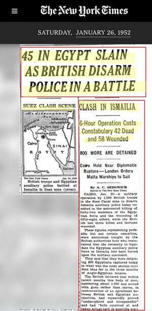 وبحسب ما نشرته نيويورك تايمز، في عددها الصادر بتاريخ 26 يناير 1952، انظر الصورة أعلاه، "القاهرة، 25 يناير - عملية عسكرية شارك فيها 1500 جندي بريطاني في منطقة قناة السويس من أجل نزع سلاح قسم بوليس الاسماعيلية اليوم، أدت إلى مقتل 42 عنصراً من القوة المصرية وإصابة 48 آخرين، بينما خسر البريطانيون ثلاثة قتلى وأصيب 13. هذه الأرقام، التي تمثل خسائر محتملة ولكنها ليست مؤكدة، أعلنتها الليلة السلطات البريطانية هنا التي أكدت أن ضرورة تصفية قوة الشرطة المصرية في الإسماعيلية قد فرضت على القيادة العسكرية. البريطانيون قالوا إنهم يحتجزون 800 مصري تم أسرهم اليوم في أخطر حادث حتى الآن خلال الأشهر الثلاثة من التوتر الإنجليزي المصري.[2]