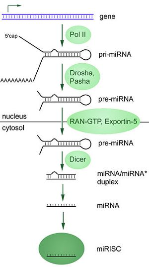ينشأ ميكرو رنا من جينات تحتوي على تسلسل نوكليوتيد متكرر بصورة عكسية (بالإنجليزية inverted repeats) عندما تدخل هذة الجينات مرحلة النسخ الأنزيمي تنتج مرسال رنا يحتوي على تسلسل نوكليوتيدي مكمل لتسلسل اخر في نفس الرنا عندها تتصل هذة التسلسلات المكملة مع بعضها البعض لتشكل سلسلة من الأزواج القاعدية وعندها يصبح شكل الرنا يشبة شكل دبوس الشعر (بالإنجليزية hairpin أو pri miRNA أنظر الصورة). بعدها يتم قص ميكرو رنا (pri mirna) عن طريق بروتين بأسم "دروشا" او" باشا" (بالإنجليزية Drosha/Pasha) ومن ثم يخرج من النواة إلى السيتوزول (هيولي الخلية) ليصبح اسم الرنا pre-miRNA (أنظر الصورة) بعدها يأتي بروتين بأسم "دايسر" (بالاأنجليزية Dicer) ليقص الرنا مرة أخرى فيصبح جزيء الرنا مكون من سلسلة من الأزواج القاعدية ولكن عندها تأتي مجموعة من البروتينات(protiens complex) بأسم "ريسك"(بالإنجليزية RISC) لتفصل سلسلة الأزواج القاعدية وتأخذ سلسلة واحدة فقط منها ليصبح اسم المجموعة البروتينية "miRISC" (انظر الصورة) يتصل miRISC مع مرسال الحمض الريبي النووي للجين المستهدف عن طريق الميكرو رنا"miRNA" الذي يحتوي على تسلسل نوكليوتيدي مكمل لتسلسل مرسال الحمض الريبوزي النووي للجين المستهدف وهكذا يتم كبت وتقليل عملية الترجمة لمرسال الحمض الريبي النووي للجين المستهدف.