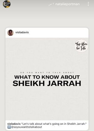 في 11 مايو 2021، أعلنت الممثلة الأمريكية-الإسرائيلية ناتالي بورتمان تضامنها مع الفلسطينيين بعد الإعتداءات الأخيرة في القدس والمسجد الأقصى. ونشرت بورتمان مقالاً عبر صفحتها على إنستگرام، حول حي الشيخ جراح، متضامنة مع احترام حرية وحقوق الفلسطينيين. ورفضت بورتمان، طرد الفلسطينيين من القدس، والاستيلاء على منازلهم بدون وجه حق.[25]
