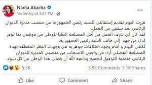 "قررت اليوم تقديم استقالتي للسيد رئيس الجمهورية من منصب مديرة الديوان بعد سنتين من العمل"، كانت تلك عبارة من التدوينة المدوية التي أعلنت فيها نادية عكاشة، مديرة ديوان قيس سعيّد، مساء الإثنين 24 يناير توديع رئاسة الجمهورية، وطي صفحة عملها إلى جانب الرئيس التونسي.