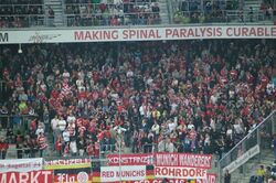 وعلى الرغم من اضطرار غالبية جماهير النادي إلى اجتياز أكثر من 200 كلم للوصول إلى ملعب أليانز أرينا إلا أن ملعب الفريق عادةً ما يكون ممتلئاً بشكلٍ شبه دائم،[108][109][110] وفي دراسة أجرتها الـسبورت ماركت فالبايرن هو خامس الأندية شعبةً على الصعيد الأوروبي بحوالي 20.7 مليون مشجع، والأول على صعيد ألمانيا حيث يمتلك 10 ملايين مشجع ضمن ألمانيا فقط.[111] كما يعرف عن البايرن جماعات الألتراس المنظمة جداً الخاصة به، وأبرز هذه الجماعات هي الـشيكاريا ميونيخ، الـريد ميونيخ 89، الـسود كورف(المدرج الجنوبي) 73، الـميونيخمانياك 1996، الـسيرفيس-كرو-ميونيخ، الـريد إنجيل (الملائكة الحمر)، الـتافيرنين كرو ميونيخ و الريد شارك (القروش الحمر). والأغنية الشبه رسمية للنادي هي الـستيرن ديس سودان. وفي التسعينات اعتاد المشجعون أن ينشدوا أغنية فورويفير نمبر وان (دائماً الرقم واحد).[112]