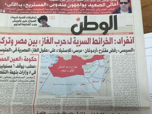 الخرائط السرية لحرب الغاز بين مصر وتركيا، جريدة الوطن، 8 أبريل 2015. العنوان الرئيسي للصفحة الأولى ويغطي كذلك صفحتين متقابلتين داخل الصحيفة.