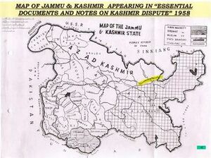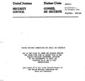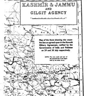 Map of the State of Jammu and Kashmir showing the Cease Fire Line as Agreed Upon in the Karachi Agreement, Ratified by the Governments of India and Pakistan on 29 and 30 July Respectively. (See Annex 26 to the third Interim Report of the United Nation Commission for India and Pakistan)[22][23]