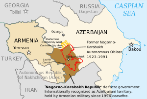 نزاع ناگورنو قرةباخ، هو نزاع إقليمي وعرقي بين أرمينيا وأذربيجان على إقليم ناگورنو قرةباخ المتنازع عليه والمقاطعات السبع المجاورة، والتي تعتبر تحت الإدارة الفعلية لجمهورية آرتساخ، المعلنة ذاتياً، لكنها معترف بها بحكم القانون كجزء من أذربيجان. ترجع أصول النزاع لأوائل القرن العشرين. في عهد الاتحاد السوڤيتي، قرر يوسف ستالين جعل إقليم ناگورنو قرةباخ أوبلاست ذاتي الحكم تابع لأذربيجان السوڤيتية.[21] بدأ النزاع الحالي عام 1988، عندما طالب أرمن قرةباخ بنقل قرةباخ من أذربيجان السوڤيتية إلى أرمينيا السوڤيتية. في أوائل التسعينيات، تطور النزاع إلى حرب واسعة النطاق.