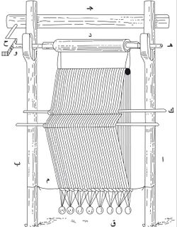 (ا، ب) قائمتا النول، (جـ) عارضة لتثبيت القائمتين، (د) أسطوانة للف القماش