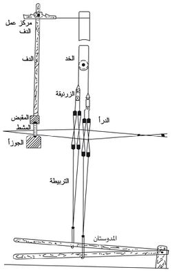 (ك) سماسم الأشتيك (عارضة تفريق الخيوط)، (م) حبل لمنع اهتزاز الأثقال
