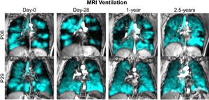 MRI with inhaled Xe-129 shows improved ventilation over[13] time. H(grayscale)+129Xe MRI (cyan) slices at day 0, day 28, 1-y and 2.5-y follow-up, Anti-IL-5Rα (benralizumab)-treated Eosinophilic Asthma