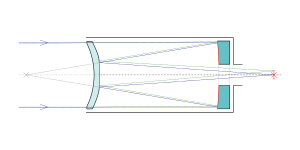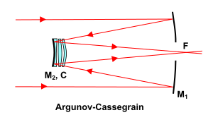 In sub-aperture corrector designs, the corrector elements are usually at the focus of a much larger objective. These elements can be both lenses and mirrors, but since multiple surfaces are involved, achieving good aberration correction in these systems can be very complex.[4] Examples of sub-aperture corrector catadioptric telescopes include the Argunov–Cassegrain telescope, the Klevtsov–Cassegrain telescope and sub-aperture corrector Maksutovs, which use as a "secondary mirror" an optical group consisting of lens elements and sometimes mirrors designed to correct aberration, as well as Jones-Bird Newtonian telescopes, which use a spherical primary mirror combined with a small corrector lens mounted near the focus.[11]