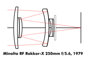 Various types of catadioptric systems are also used in camera lenses known alternatively as catadioptric lenses (CATs), reflex lenses, or mirror lenses. These lenses use some form of the cassegrain design which greatly reduces the physical length of the optical assembly, partly by folding the optical path, but mostly through the telephoto effect of the convex secondary mirror which multiplies the focal length many times (up to 4 to 5 times).[12] This creates lenses with focal lengths from 250 mm up to and beyond 1000 mm that are much shorter and compact than their long-focus or telephoto counterparts. Moreover, chromatic aberration, a major problem with long refractive lenses, and off-axis aberration, a major problem with reflective telescopes, is almost completely eliminated by the catadioptric system, making the image they produce suitable to fill the large focal plane of a camera.