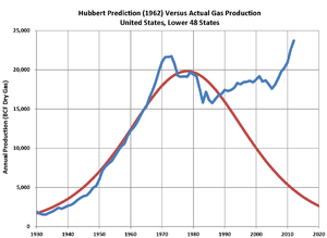 Hubbert also predicted that natural gas production would follow a logistic curve similar to that of oil. The graph shows actual gas production in blue compared to his predicted gas production for the United States in red, published in 1962.[3]