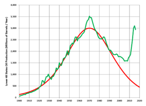 The Hubbert peak theory is based on the observation that the amount of oil under the ground in any region is finite, therefore the rate of discovery which initially increases quickly must reach a maximum and decline. In the US, oil extraction followed the discovery curve after a time lag of 32 to 35 years.[1][2] The theory is named after American geophysicist M. King Hubbert, who created a method of modeling the production curve given an assumed ultimate recovery volume.
