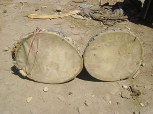 طبق نحاس عرضه 30 سم وتجويفه 15 سم، ويتم عمل فتحة في أسفل الطبق حتى لا يحبس الصوت ويصدر صدى للنقر، مثبت في جلد من رقبة الجمل ليعطي صوتًا رقيقًا ومختلف عن الطبل البلدي حيث يستعمل جلد الماعز.