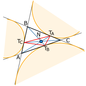 نقطة ناگل هي isotomic conjugate لنقطة جرگون. نقطة ناگل، the incenter, and the centroid are collinear. The incenter is the Nagel point of the medial triangle (Anonymous 1896); equivalently, the Nagel point is the incenter of the anticomplementary triangle.