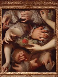 يوحِّد التكوين بين القسمين العلوي والسفلي بطريقة ماهرة هي مزيج من انسجام حار بين النظرات والحركات، ومن اعتماد الألوان البنية المذهبة والحمراء مع قليل من الألوان البنفسجية المخففة، ومن رداء القديسة الأزرق والأخضر الذي يشكّل نقطة من لون بارد في مساحة اللوحة. أما أغطية الرأس والتعبيرات والحركات فقد صوَّرها المصور بجرأة وحميميّة فلمنكية، تفجرت جميعاً في طريقة معالجته للثياب والشعور المستعارة.
